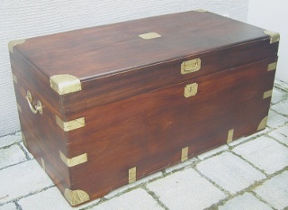 Schöne Kampferholztruhe mit den typischen Messingbeschlägen. Kampferholz wird wegen seines Geruchs von Schädlingen (z.B. Motten) gemieden und wurde daher gern für Koffertruhen verwendet. Der Kampferbaum stammt aus Asien (Korea, Vietnam, Japan) und derartige Koffertruhen wurden früher von Reisenden mit in unser Gegenden gebracht. Diese Truhe ist um die 80 Jahre alt und stammt aus dem Nachlaß eines Hamburger Kapitäns. Auf dem Deckel befinden sich zwei Risse im Holz, die die Stabilität jedoch nicht beeinträchtigen. Sie ist sehr solide und schwer.