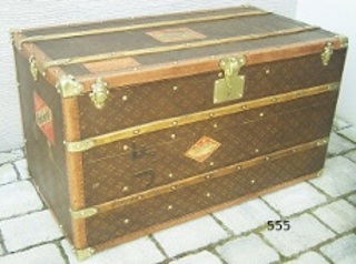 Ein ehemaliger Schrankkoffer wurde hier zur Truhe umfunkioniert. Dieses Koffer der bekannten Marke "Aux Etats-Unis" wurde von einer Nachahmer- und Nachbarfirma des weltbekannten Pariser Herstellers Louis Vuitton angefertigt. Qualitativ sehr hochwertig gearbeitet sind auch diese Koffer mittlerweile begehrte Sammlerstücke. Das Alter diese Koffers liegt bei etwa 80-100 Jahren. Der Innenraum ist neu mit Stoff ausgekleidet. - VERKAUFT -